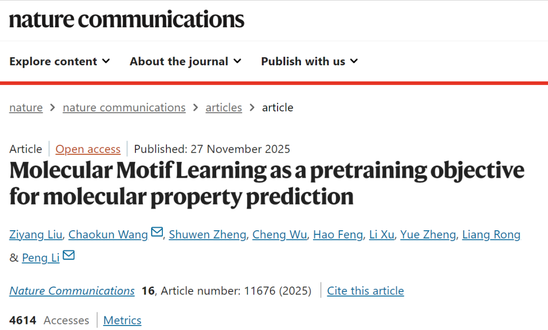 2025年11月27日,清华大学王朝坤与李蓬团队在《Nature Communications》上发表论文,题为“Molecular Motif Learning as a pretraining objective for molecular property prediction”。