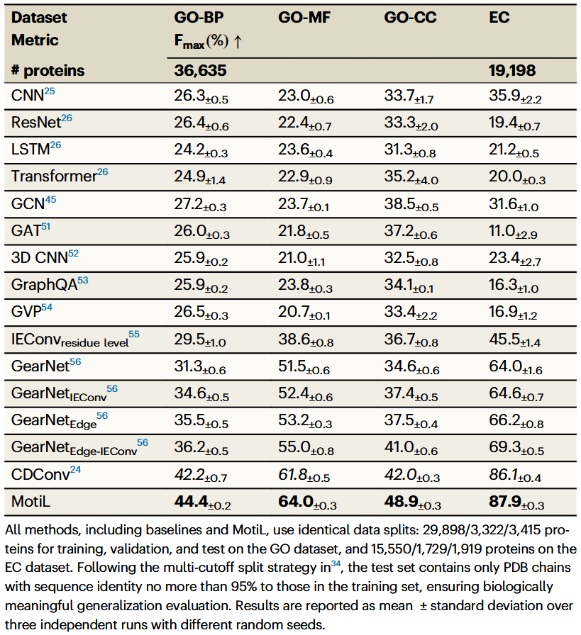 接下来,在两个蛋白质数据集上评估不同方法的Fmax性能,结果见表3。结果表明,MotiL持续优于包括GearNet和CDConv在内的图方法,显示出其在计算生物学中的广泛应用潜力。