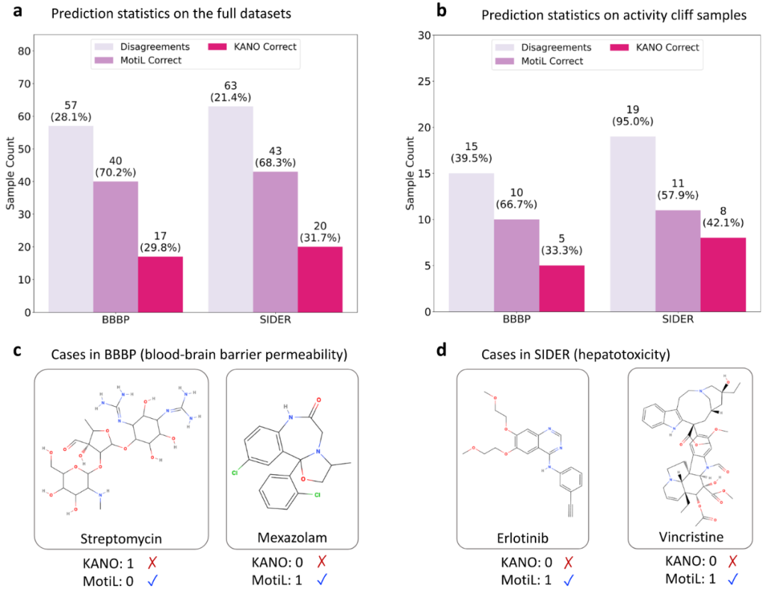 在两个与毒性相关的基准数据集BBBP与SIDER上,对MotiL与最强基线KANO的预测分歧进行了系统评估。图4a展示了完整数据集上的分歧统计,图4b给出了活性悬崖实验结果。该实验用于评估模型在“结构高度相似但标签不同”的困难分子对上的鲁棒性。这些结果表明,MotiL在处理模糊或困难样本时优于KANO。图4c-d分别展示了BBBP与SIDER中的代表性示例。这些定性结果补充了统计分析,并揭示了MotiL在化学结构复杂或临界样本中的判别机制。