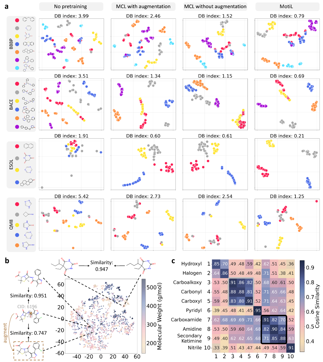 接着在多个数据集上可视化所有分子的t-SNE表示(图2b)。对于一对分子,通过RDKit指纹的Tanimoto系数计算其结构相似度(RDKFP相似度)。从图2b可见,RDKFP相似度高于90%的分子对在BBBP数据集的表示空间中通常彼此接近。此外,插入一个增强分子以验证图增强的影响。该增强分子通过对子图删除从CID为6196的分子生成(棕色虚线框标出)。由于被删除的酰胺基是关键官能团,增强分子与原分子的RDKFP相似度<75%,在表示空间中也被投影得更远。相比之下,与原分子相似度为0.951的另一个分子距离更近。值得注意的是,酰胺基的极性、形成氢键的能力以及增加分子刚性的潜力通常会降低分子通过血脑屏障的能力。这些结果表明,MotiL能同时捕获小分子的结构属性和功能属性并能区分由增强构造的易混淆分子对。