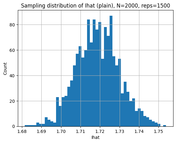 Plain : Ihat=1.72215757, SE=3.466e-03, 95% CI=(np.float64(1.7153641635016394), np.float64(1.7289509773653648))
