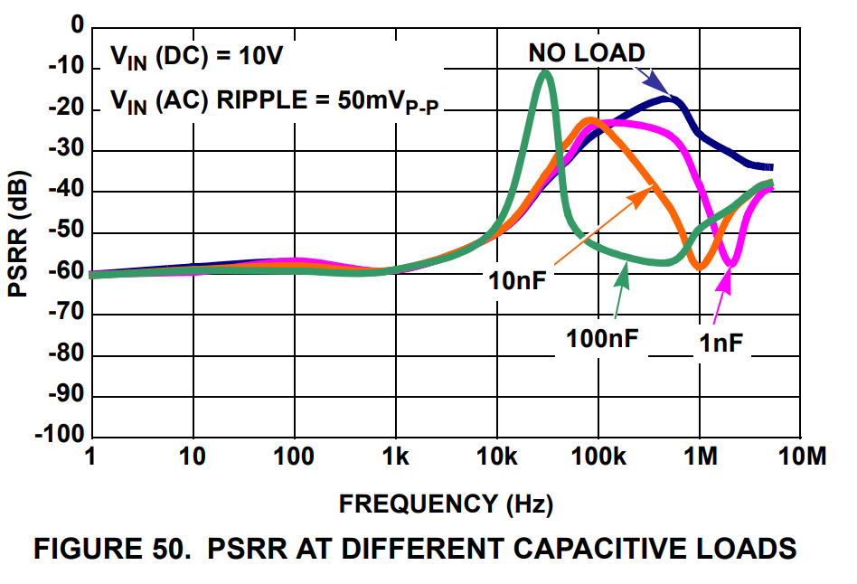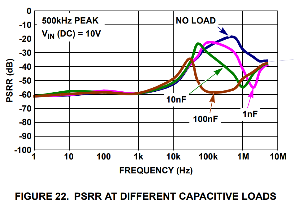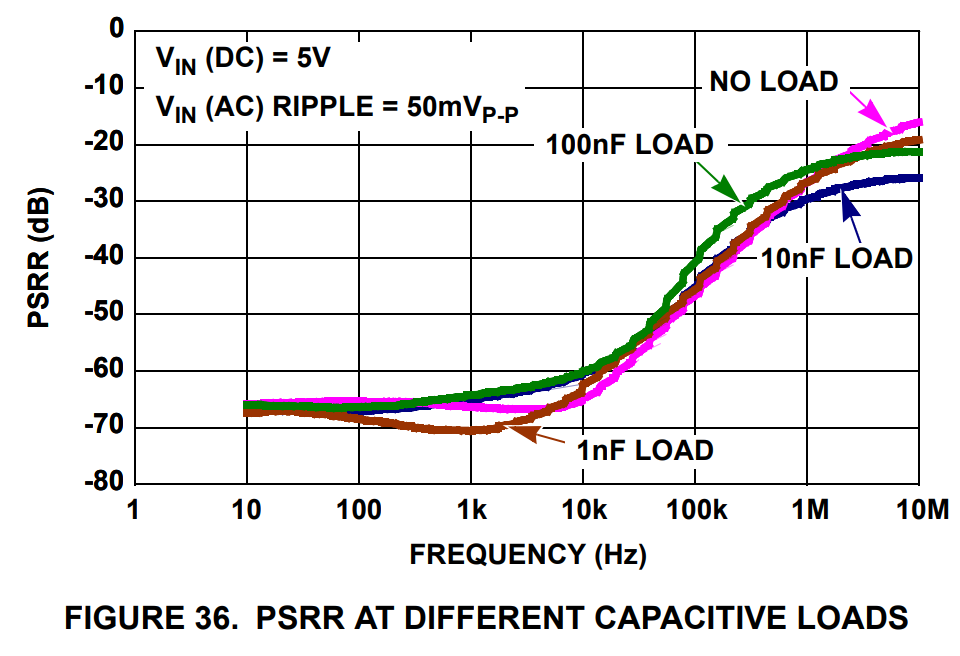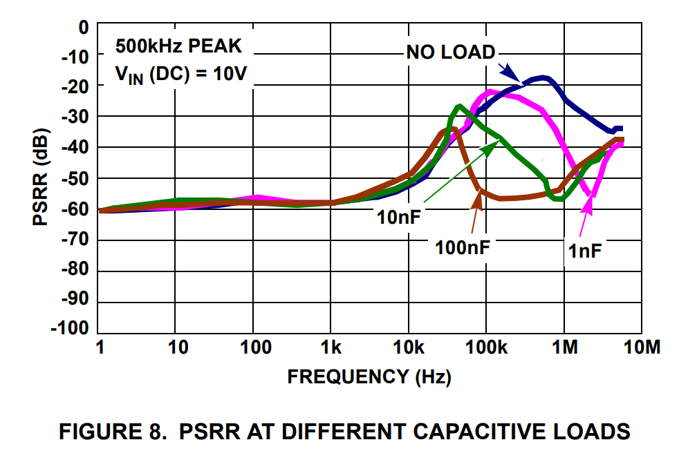 低频 PSRR 很好,高频衰减明显,所以必须在 VIN 端加 0.1µF + 10µF 去耦,否则前级的电源噪声会直接调制 Vref。
