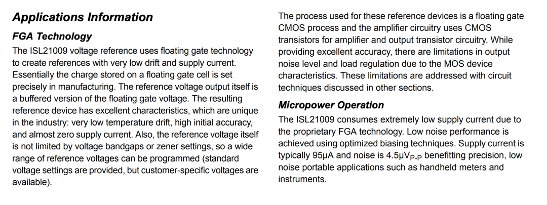 所以它可以做到:±0.5 mV 初始精度,而不需要外部修调。传统基准必须持续维持带隙电流来维持偏置;但是对于FGA浮栅电荷已经存好,只需要一个缓冲放大器,所以静态电流可以做到95 µA 级别。