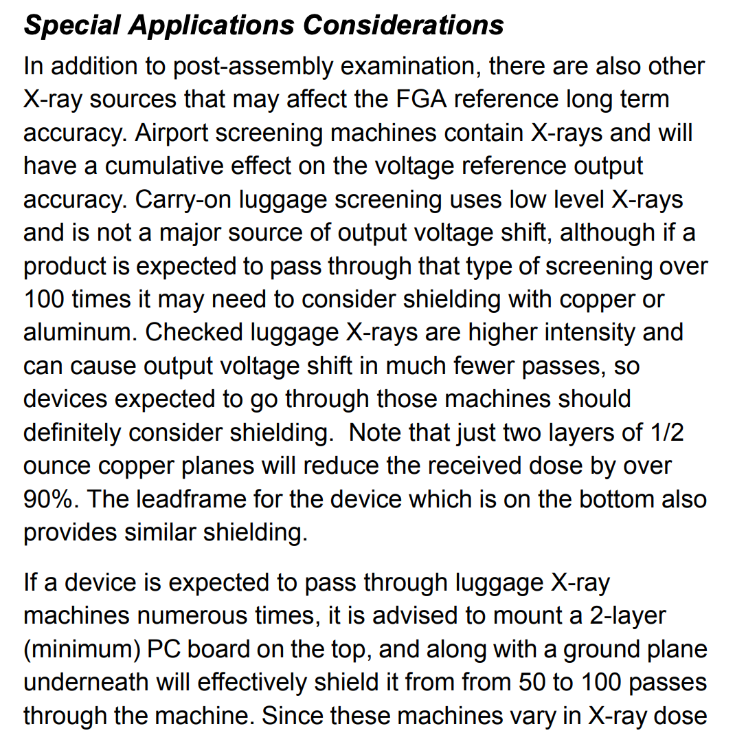 因为X-ray 会:激发氧化层中的电子,改变浮栅电荷;那电荷改变 → Vref 改变这在数据手册第16页有专门说明这是 FGA 独有的问题。