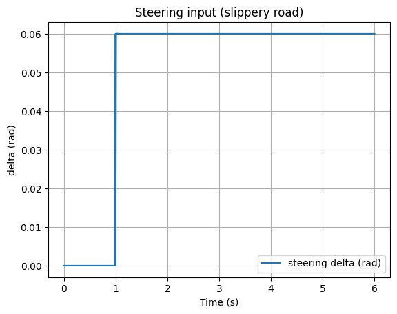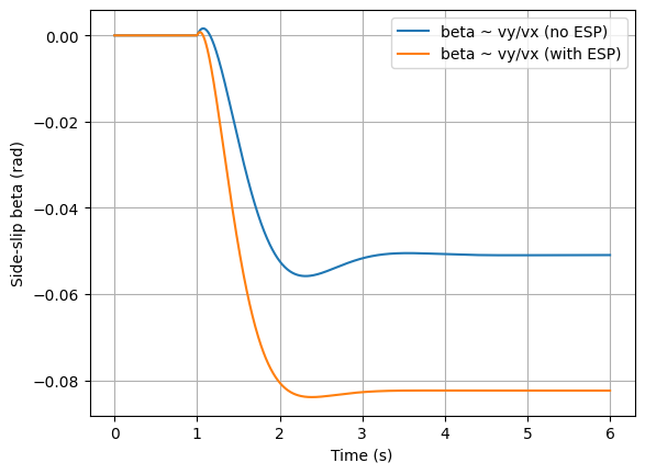 用线性单轨(bicycle)模型描述车辆横向动力学,并把 ESP 的作用等效为一个可控的“附加横摆力矩” (真实车上来自“单轮制动”产生的力矩)。