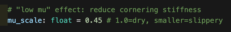 dvy, dr, ay_true, Fx_total, Fy_total, Mz_br = plant_step(p, vy, r, delta, Fx_wheels)