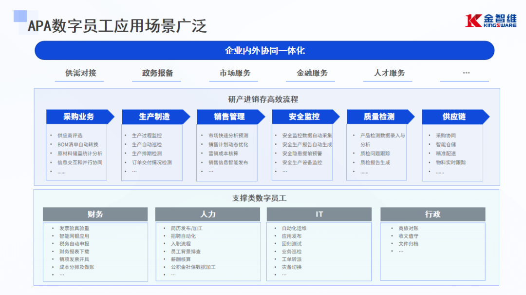 在金融机构中,基于 K-APA 的 AI 数字员工被用于费用处理、数据核对、报表汇总等核心流程,在显著提升处理效率的同时,降低了人工操作带来的差错与合规风险;在政务及大型组织的信息管理场景中,AI 数字员工可在多个业务系统之间自动流转、校验与同步数据,减少人工介入;在人力运营领域,K-APA 支撑的智能体通过自动完成信息收集、状态更新与提醒反馈,帮助管理部门从高频事务性工作中解放出来;在 IT 运维场景中,AI 数字员工还可协助完成监控、告警处理与基础运维操作,提升整体运行稳定性。