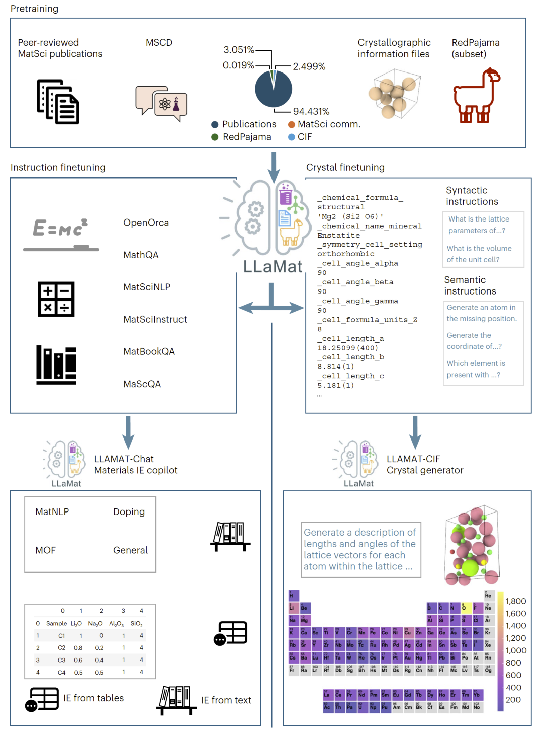 图1: LLaMat在综合材料科学研究中的开发流程与核心能力示意图。