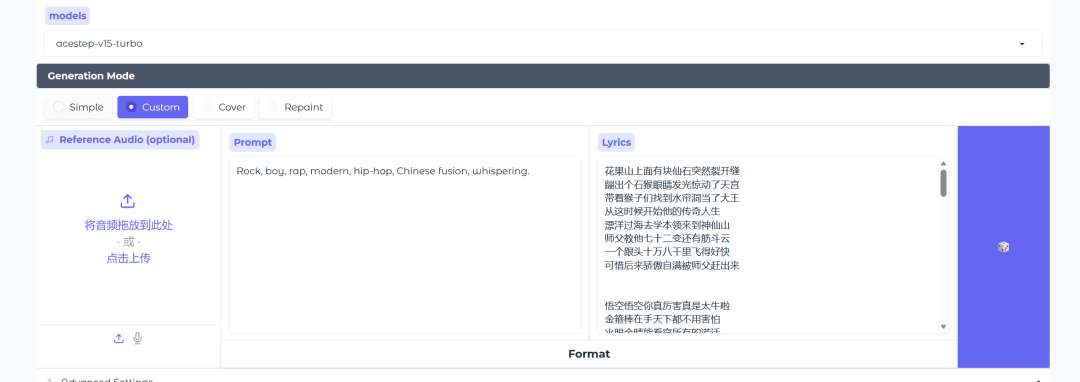 还记得Suno V5前段时间带火的AI西游记人物唱歌吗?几个视频就带来了超过千万的播放量,按着视频激励条件结算,起码要有4000-10000的收益,这还不包括涨粉后的粉丝收益,以及广告等隐形收益,但是这个SUNO v5每次的成本大概有1块钱,但是现在ACE-Step直接把成本压低到几乎为0,这4G显存,不是市面上90%的显卡都能畅玩了吗?