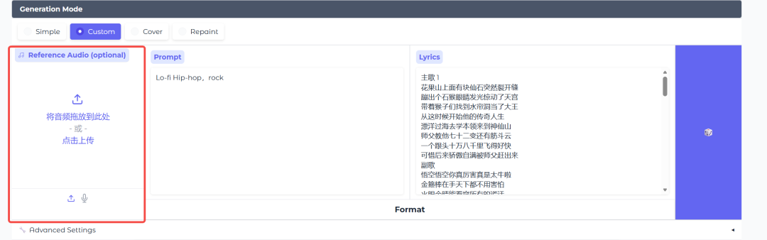 歌词要写在Lyrics里面,左边是曲风,右边是歌词,不填写歌词只能生成纯音乐