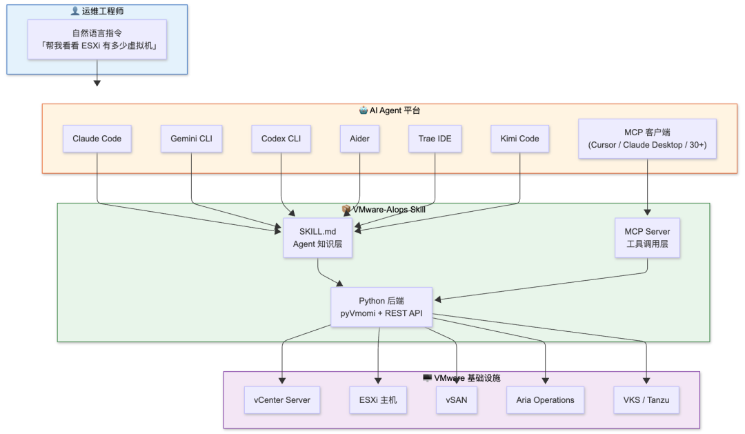 VMware-AIops 只是一个起点。当 Agent 能管 vCenter,它也能管 Kubernetes、管网络、管存储。当每个运维操作都变成一句话,我们就能把精力放在更有价值的事情上——架构设计、容量规划、故障预防。