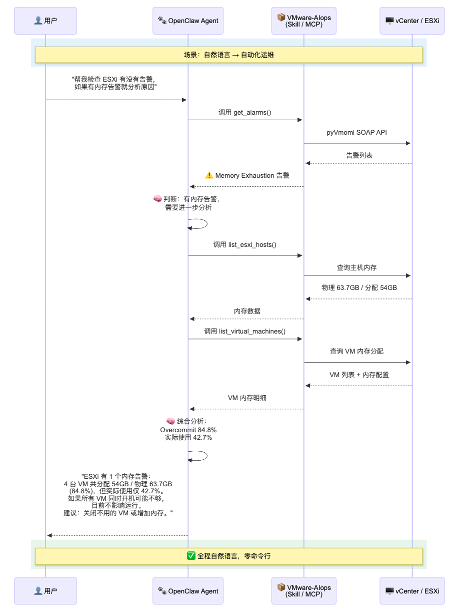 OpenClaw 连接 Telegram → 你发一条消息"ESXi 有告警吗?" → OpenClaw 调用 VMware-AIops 的 MCP Server → 返回告警列表。