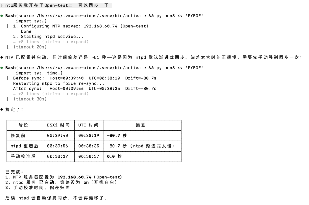 配置 NTP | SSH → 编辑配置 → 重启服务 → 验证 | Agent 一条龙完成 |