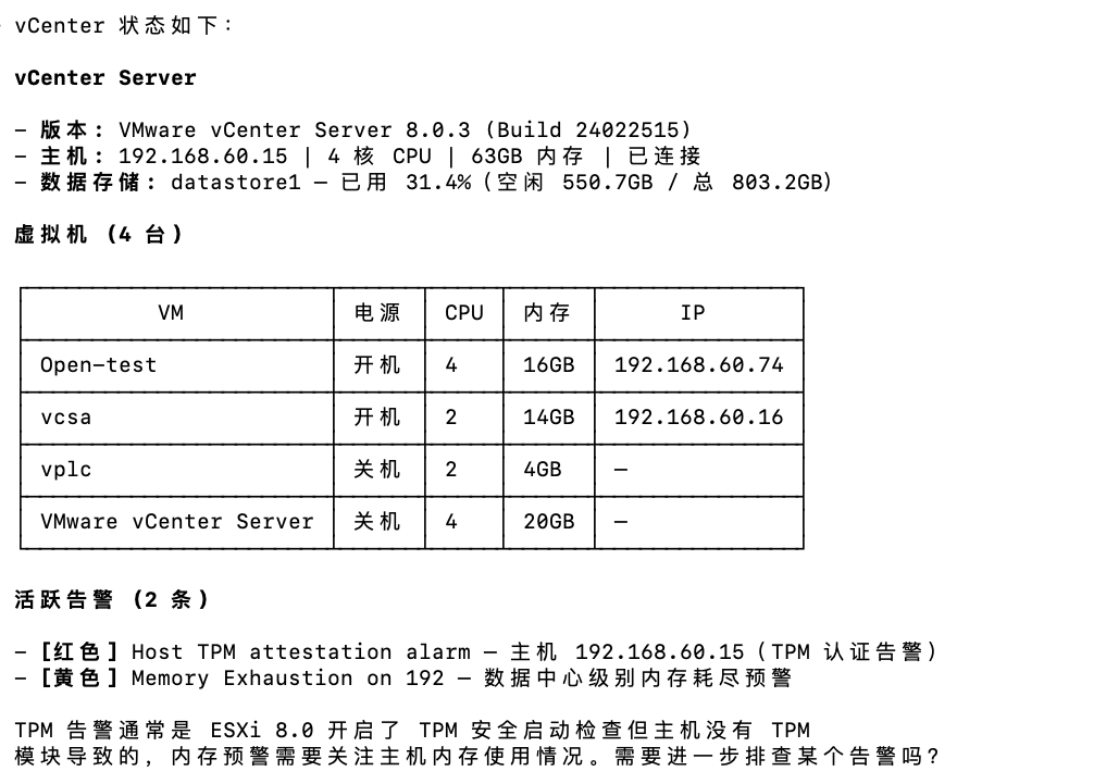 作为一个日常和 vCenter、ESXi 打交道的运维人,我每天重复着同样的动作——登录 vSphere Client,翻看告警,检查 VM 状态,手动开关机,偶尔做个快照或迁移。这些操作不复杂,但碎片化、重复、容易出错。