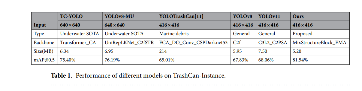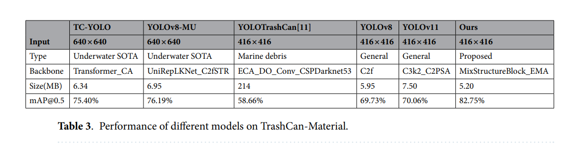 在TrashCan-Instance和TrashCan-Material数据集上的大量实验证明了所提模型的有效性。与基线YOLOv11和其他最先进的水下专用模型相比,我们的方法取得了优越的性能,在TrashCan-Instance上的mAP@0.5最高达到81.54%,在TrashCan-Material上达到82.75%。同时,我们的模型大小相较于先前研究更为轻量,仅为5.2 MB。消融研究进一步证实了EMA和MixStructureBlock对检测精度和鲁棒性的独立及联合贡献。