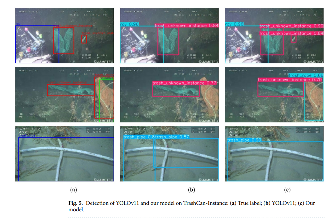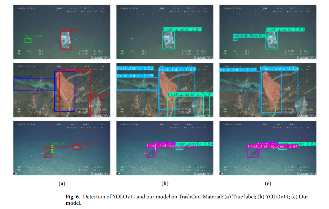 为直观展示我们提出的模型带来的检测性能提升,图5展示了TrashCan-Instance数据集上的视觉比较,分为三组:(a) 真实标注,(b) 原始YOLOv11的预测,和 (c) 我们改进模型的预测。每一行对应一个场景,涵盖了各种具有挑战性的水下条件,如遮挡、类别模糊性和复杂背景。