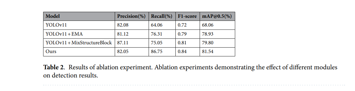 当两个模块结合时,它们的互补优势导致了精确率和召回率的同时提升,从而获得了最高的整体mAP@0.5(81.54%)。这证实了MixStructureBlock和EMA解决了基线YOLOv11的不同弱点:前者改进了空间结构表示,而后者增强了多尺度注意力和全局上下文聚合。它们的联合效果证明了在最终模型中采用的架构修改是合理的。