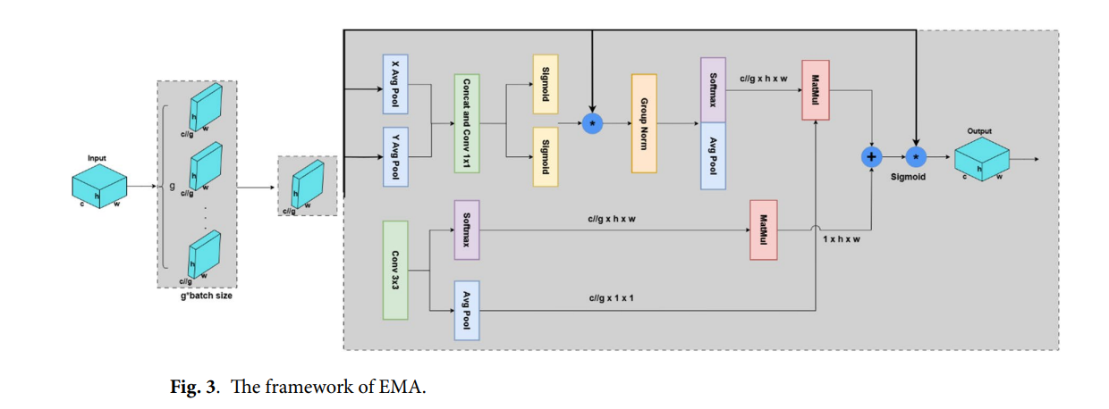 为了增强模型在视觉复杂的水下环境中感知和区分海洋垃圾的能力,我们用高效多尺度注意力模块替换了YOLOv11中原始的C2PSA模块。引入的EMA模块旨在改进多尺度特征提取并自适应地关注显著区域,特别有利于检测水下场景中常见的小型、重叠和低对比度物体。许多实验已证明,将EMA引入YOLO能提升检测性能。在图3中阐述了EMA模块的框架。