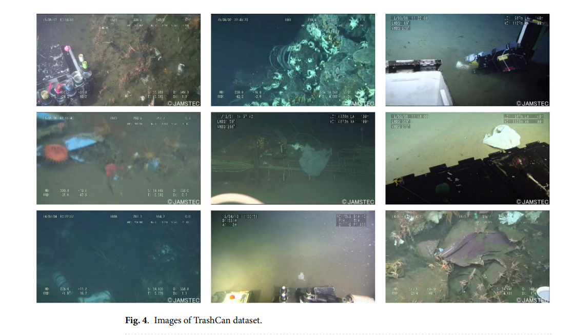 为了有效训练和评估我们提出的水下垃圾检测模型,我们使用了TrashCan数据集,这是一个专门为海洋视觉任务设计的大规模基准数据集。该数据集构建自日本海洋地球科学技术机构维护的J-EDI深海图像电子图书馆。它包含在日本周边不同海域、在各种光照和环境条件下拍摄的超过1000个水下视频。