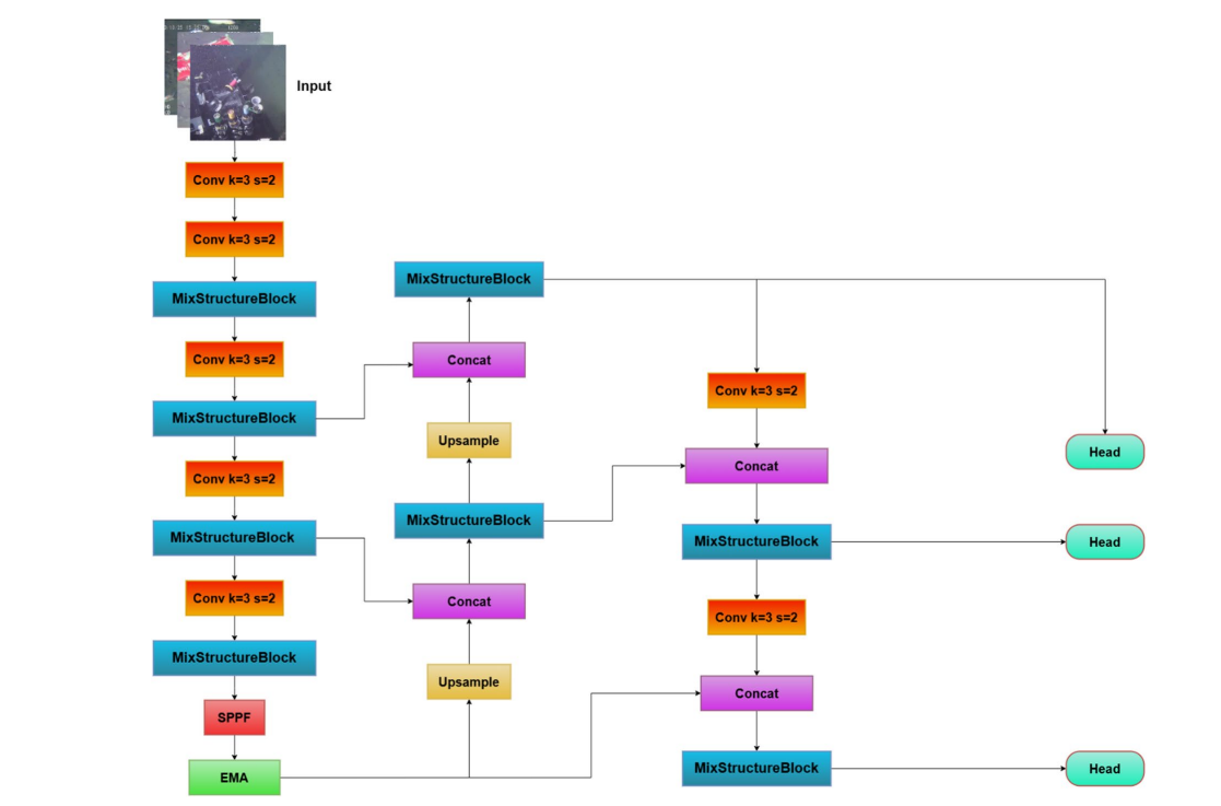 本节描述了所提方法的整体架构,该方法基于YOLOv11目标检测框架构建。为了增强模型在水下海洋垃圾检测方面的能力,我们引入了两个新颖的结构组件:嵌入到骨干网络中的MixStructureBlock,以及集成到检测头中的EMA注意力模块。这些改进旨在解决水下检测任务中的常见挑战,如小目标定位、遮挡和背景干扰。