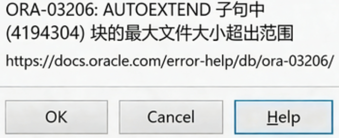 从报错信息 ORA-03206: maximum file size of (4194304) blocks in AUTOEXTEND clause is out of range 来看,Oracle 明确告诉我们:你在 AUTOEXTEND 子句里设置的最大文件大小,超过了它允许的范围。