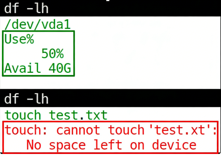就像图中展示的这样,执行df -lh发现根目录使用率仅50%,剩余40G空间,但创建文件时却无情报错,此时就需要借助df -i命令排查根源。