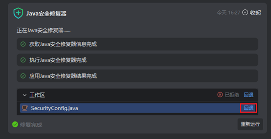 检测出漏洞后,不用手动修改代码,点击“一键修复”,飞算JavaAI就会自动生成安全的代码,替换掉有漏洞的部分,还会保留原有的业务逻辑,不会影响项目正常运行。