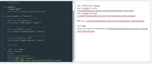 通过Python实现字符串反转+SHA256加密,直接生成最终token,构造POST请求提交。