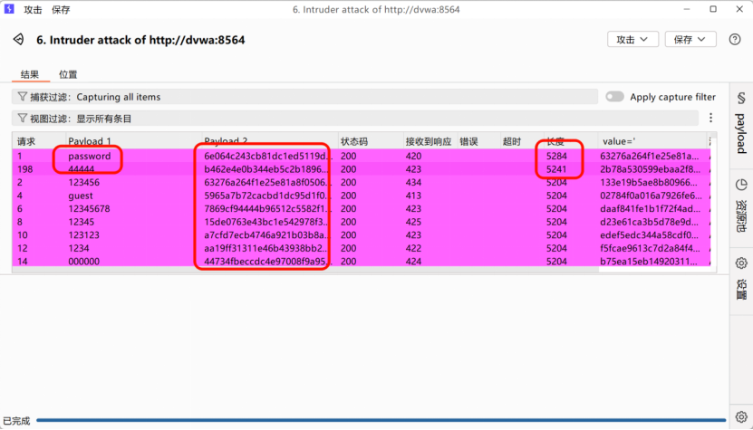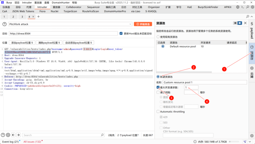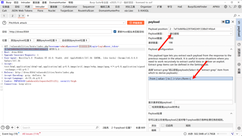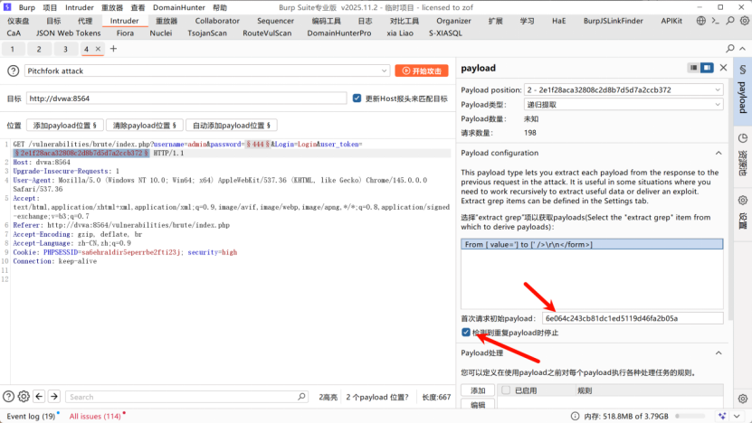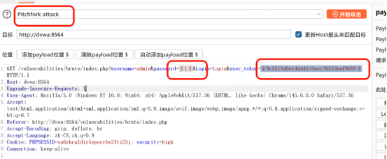 Intruder,选择Pitchfork 交叉爆破,标记password和user_token为爆破位置;