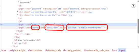 user_token藏在隐藏输入框中,攻击者无法直接获取受害者的token,但可通过XSS注入脚本自动提取受害者的token并拼接CSRF请求。