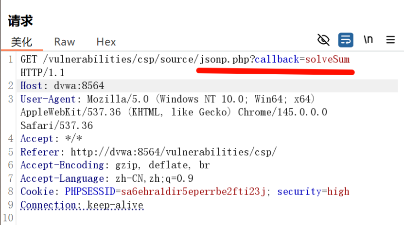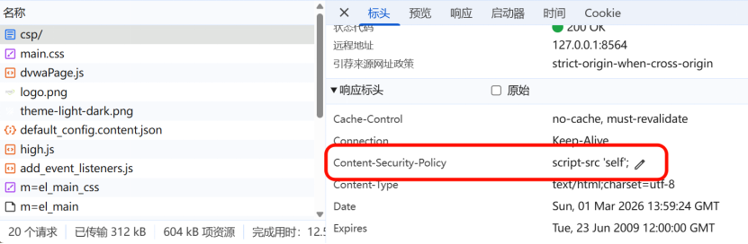 High 难度配置了内容安全策略(CSP),仅允许加载self(自身域名)的脚本,禁止外部脚本和未授权内联脚本,但靶场自身代码存在逻辑漏洞,可通过自身的JSONP接口绕过CSP。