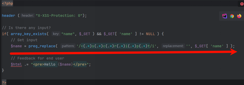 $html.="<pre>hello{$name}</pre>";使用<img>标签的onerror事件构造无script的XSS Payload,触发弹窗: