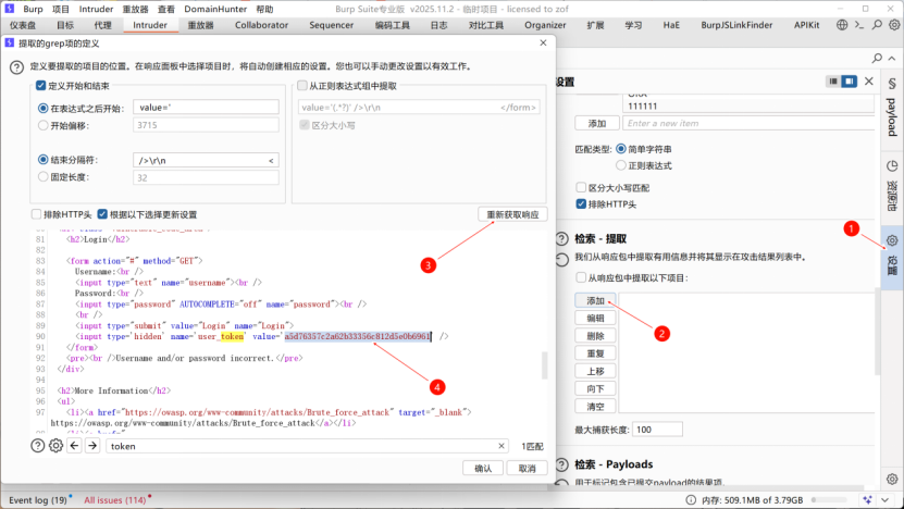 user_token的Payload类型选择递归提取,并填入初始请求的有效token(抓包获取的原始token)。