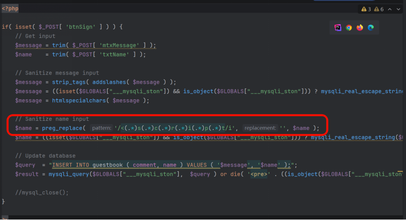 <a href=javascript:alert(1)>点击触发</a>High 难度对message字段做了多重过滤(strip_tags+addslashes+htmlspecialchars),完全无法注入;对name字段仅过滤<script>标签,可在name字段构造事件型XSS,并修改前端输入框限制实现长Payload输入。