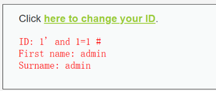 1' and 1=1 #,正常返回数据;输入1' and 1=2 #,无数据返回,注入点有效。