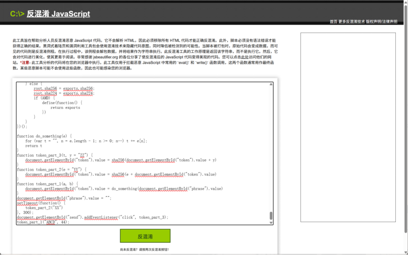 通过Burp抓包获取混淆的JS代码,反混淆后得到3个核心加密函数,执行顺序为:token_part_1 → token_part_2(300ms延时) → token_part_3(点击提交触发)。