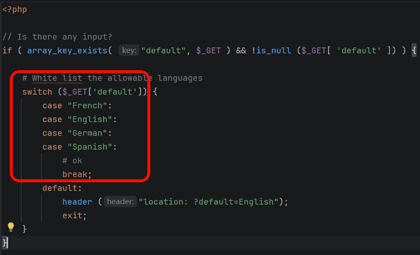 High 难度对default参数做了白名单过滤(仅允许French、English、German、Spanish),非白名单值会被重定向,可通过**#号**绕过服务器过滤(服务器不解析#后参数,前端DOM解析)。
