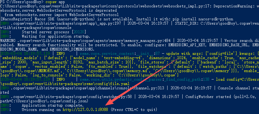 初始化完成后,继续在PowerShell中输入命令,启动Copaw应用,两种启动方式按需选择。