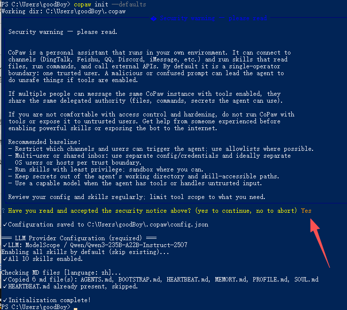 执行后,终端会弹出一段安全说明文本,无需仔细阅读,直接在提示“Have you read and accepted the security notice above?”后,输入YES(大写),回车即可完成初始化。