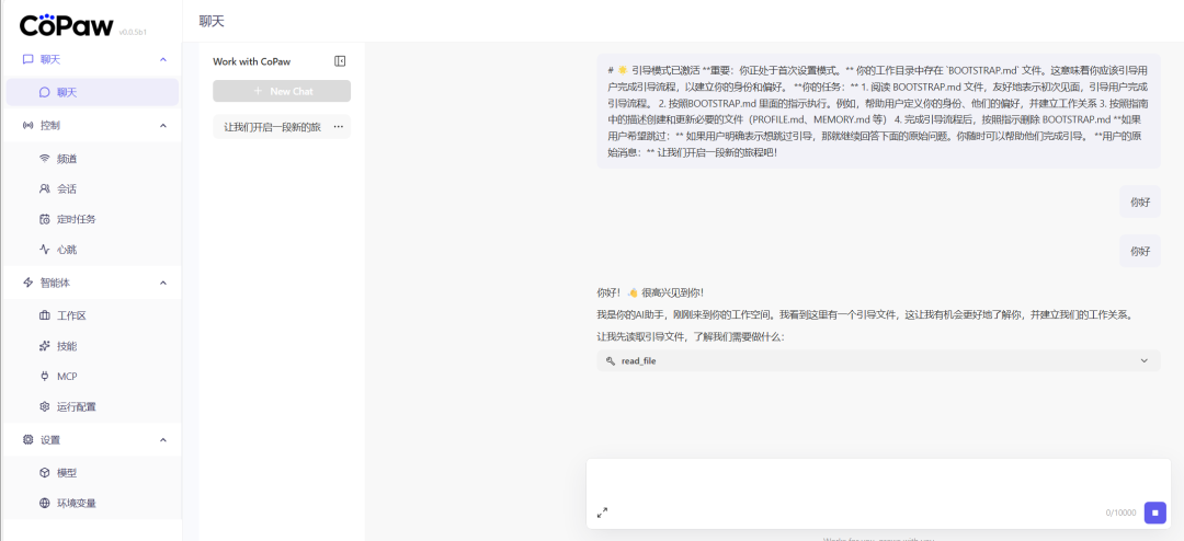 接入飞书后,无需打开浏览器和PowerShell界面,直接在飞书客户端(手机/电脑端)就能向Copaw发送指令,实现远程交互,实用性拉满。全程无需公网IP,本地部署即可使用,步骤如下: