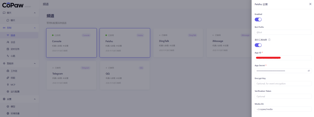 回到Copaw网页控制台,点击「频道」,找到飞书选项,填入之前复制的「App ID」和「App Secret」,保存并启用,此时飞书与Copaw已成功绑定,可正常交互。