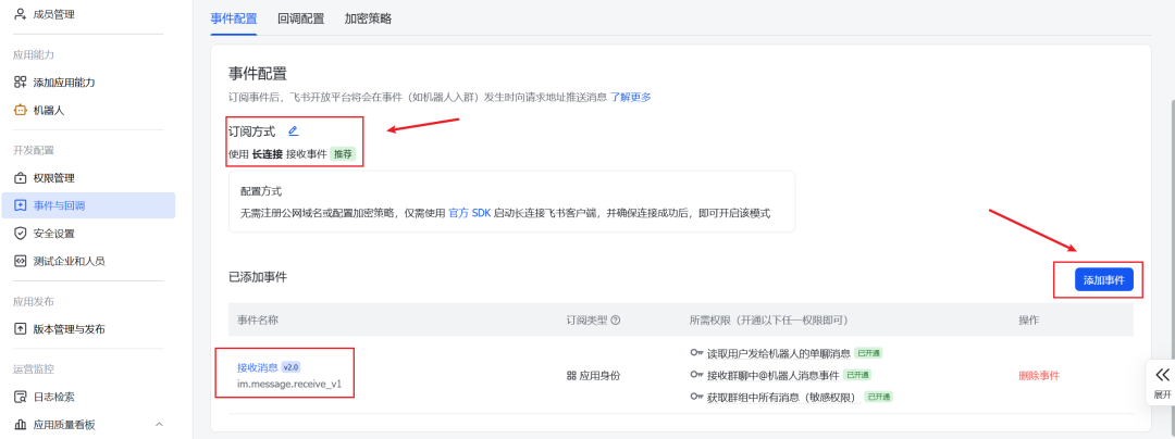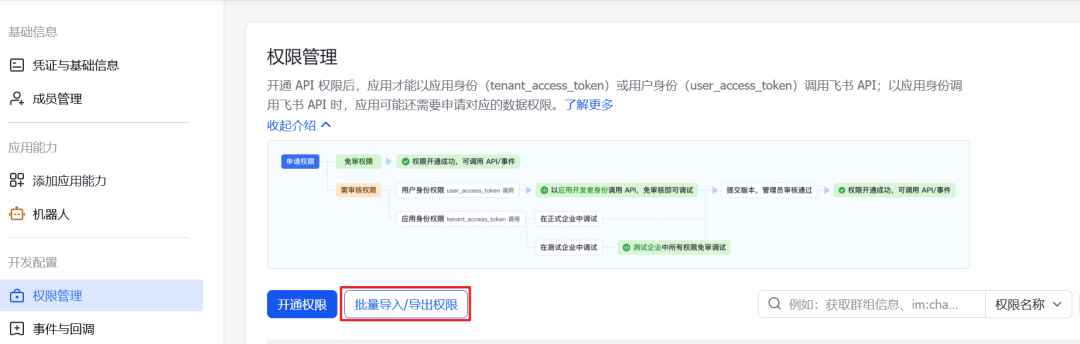 { "scopes": { "tenant": [ "aily:file:read", "aily:file:write", "application:application.app_message_stats.overview:readonly", "application:application:self_manage", "application:bot.menu:write", "cardkit:card:write", "contact:contact.base:readonly", "contact:user.employee_id:readonly", "corehr:file:download", "docs:document.content:read", "event:ip_list", "im:chat", "im:chat.access_event.bot_p2p_chat:read", "im:chat.members:bot_access", "im:message", "im:message.group_at_msg:readonly", "im:message.group_msg", "im:message.p2p_msg:readonly", "im:message:readonly", "im:message:send_as_bot", "im:resource", "sheets:spreadsheet", "wiki:wiki:readonly" ], "user": [ "aily:file:read", "aily:file:write", "contact:contact.base:readonly", "im:chat.access_event.bot_p2p_chat:read" ] }}粘贴上方命令放到权限里面