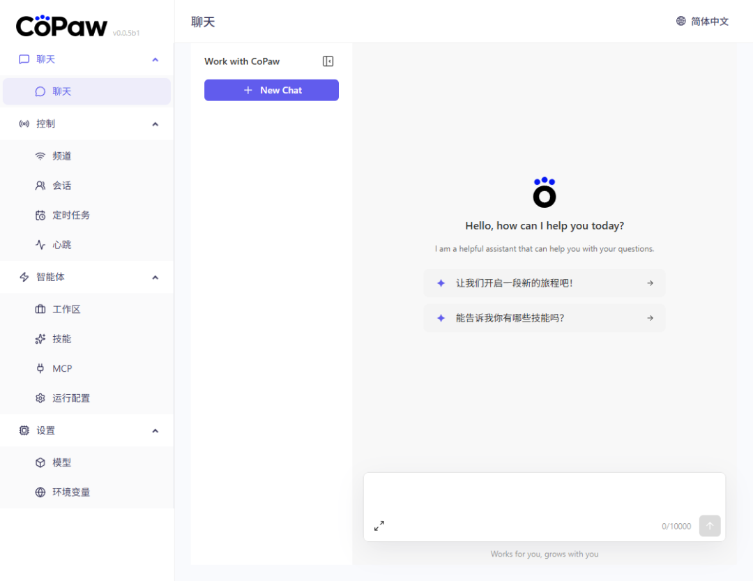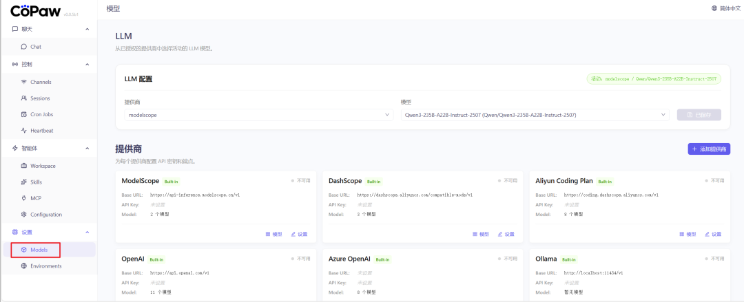 copaw app --port 9090copaw app --host 0.0.0.0 --port 9090Copaw本身不自带大模型,需要接入外部大模型API才能实现对话、任务执行等功能。
