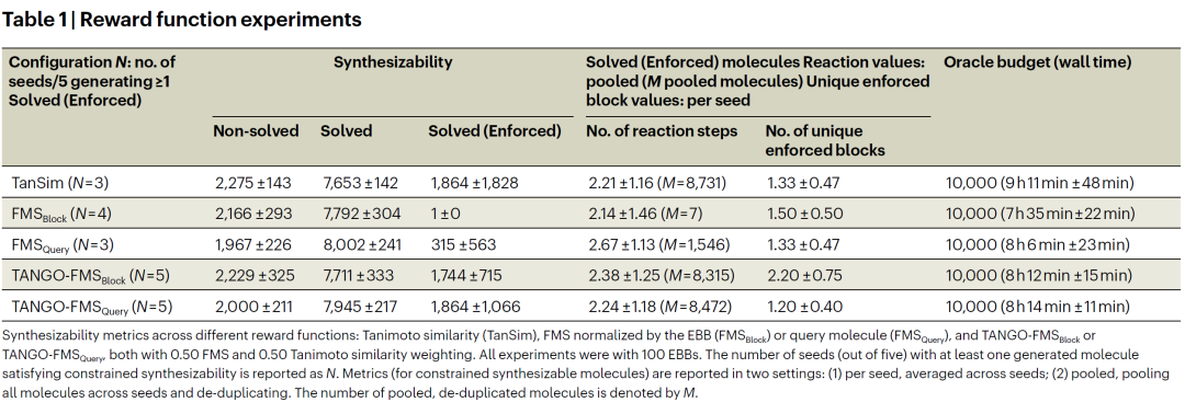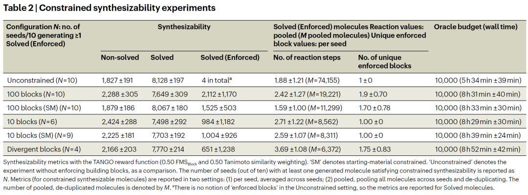 然而,该方法仍存在若干局限。首先,TANGO 依赖逆合成模型的准确性,而当前逆合成算法本身仍存在区域选择性与立体选择性预测不完备的问题。其次,当可用构建块库存规模较小时,合成路径搜索失败将带来二元奖励中断问题,可能影响优化稳定性。此外,本研究主要聚焦单一构建块约束,多构建块联合约束仍有待进一步探索。