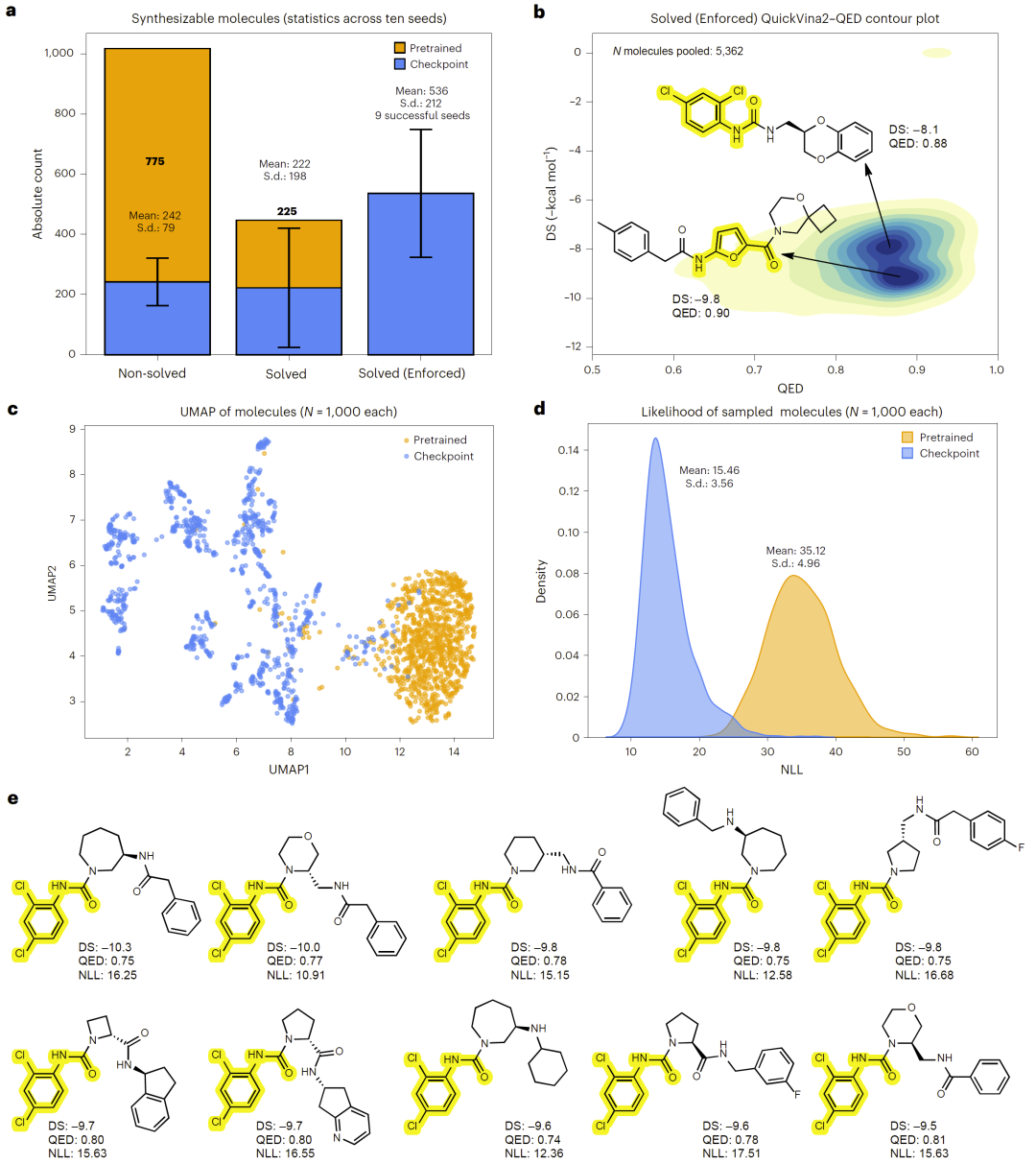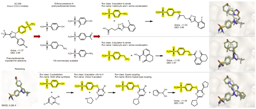 在一个更接近真实药物设计场景的案例中,研究人员强制在生成分子的合成路径中包含苯磺酰胺结构单元,该基团已知与 COX-2 选择性相关。