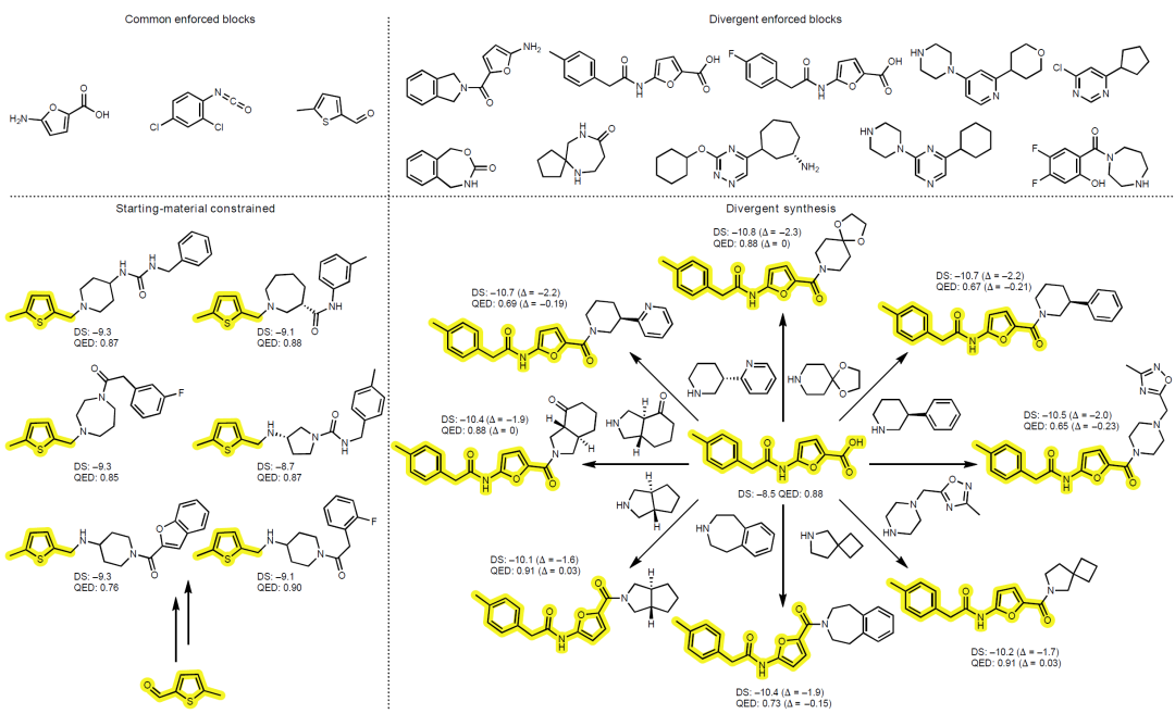 图2:在起始原料约束与发散合成约束(由非商业公共中间体一步合成至多样化高奖励分子)下生成的示例分子。