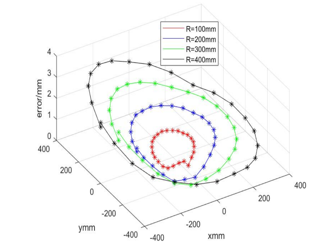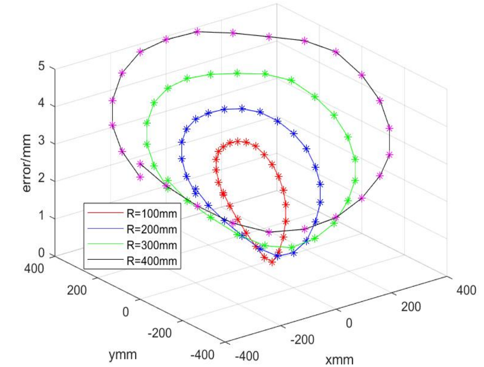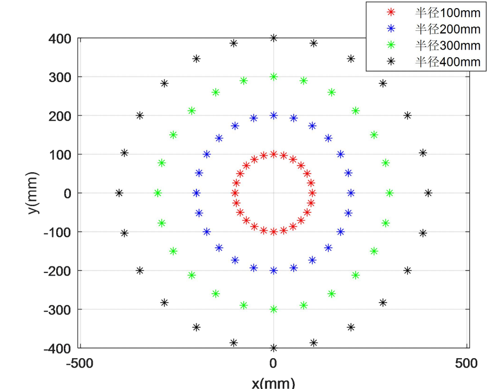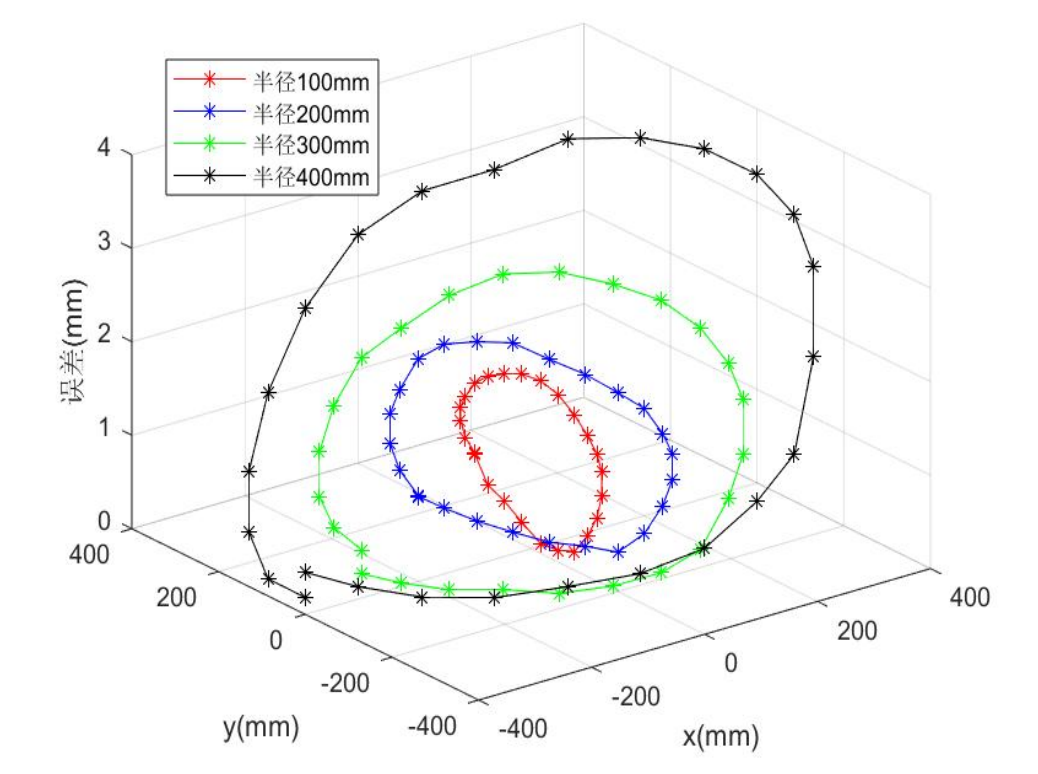 机械臂以其第一个自由度的法兰盘中心为圆心,分别进行半径为100mm、200mm、300mm、400mm 的圆轨迹运动。对这些运动圆轨迹上等角度的25个点进行采集数据,位置点都间隔30 度,将测量数据与理论位置进行比较,计算两者的差值,得到视觉测量数据,视觉测量数据包括机械臂实际运动误差和视觉测量误差。